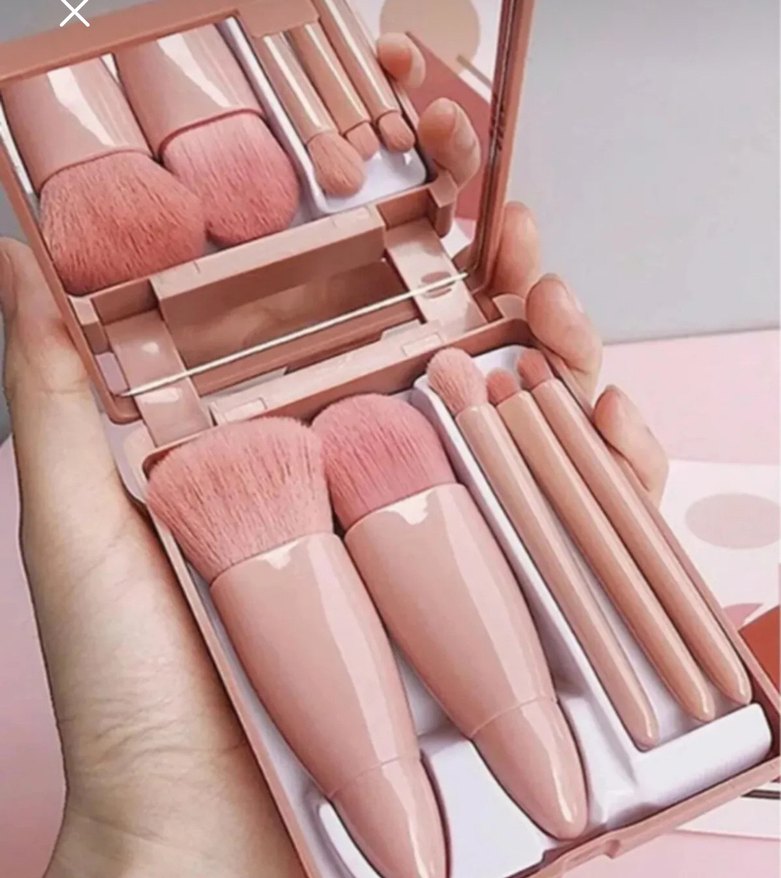 Çeşitli fırça türlerine sahip açık pembe makyaj fırçası seti, kompakt ayna ile birlikte. Yumuşak kıllar, pürüzsüz uygulama sağlar.