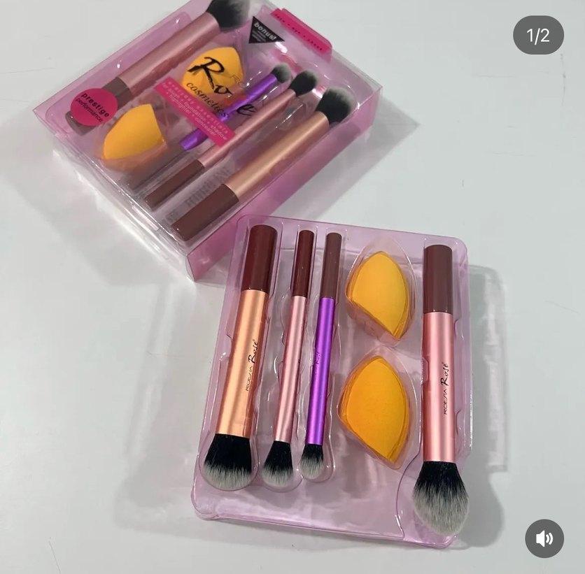 Çeşitli fırçalar ve iki sarı makyaj süngeri içeren açık pembe makyaj fırça seti. ️