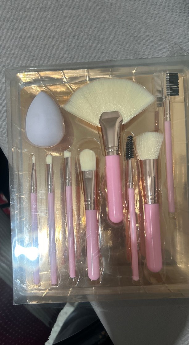 Çeşitli makyaj uygulamaları için farklı fırça tipleri ve makyaj süngerinden oluşan açık pembe makyaj fırçaları seti. Hiç kullanılmadı