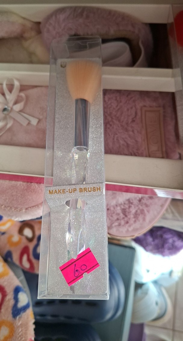 Yumuşak kıllı, şeffaf saplı açık pembe makyaj fırçası. allık fırçası