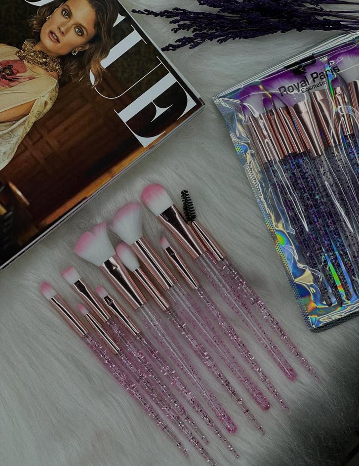 Parlak saplı, açık pembe kıllı 10'lu makyaj fırçası seti, farklı makyaj uygulamaları için uygundur.
