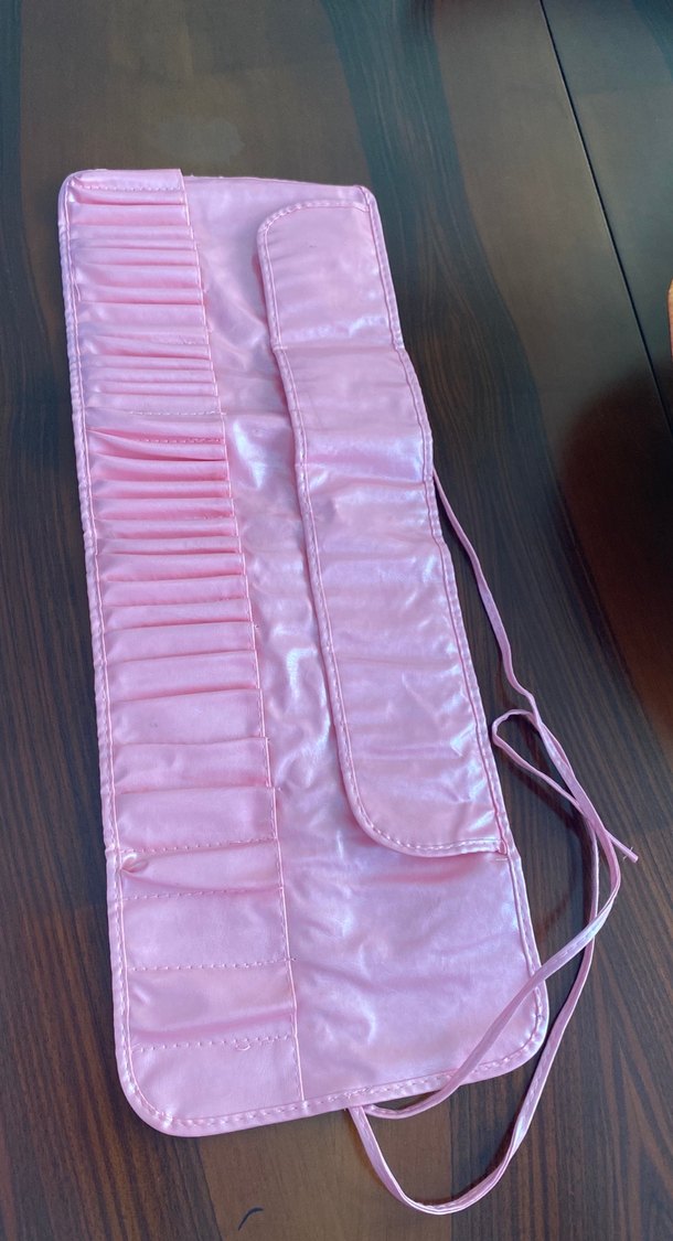 Pastel pembe renkte, makyaj fırçalarını düzenli tutmak için çoklu bölmelere sahip, yumuşak kumaştan yapılmış bağcıklı kutu. fiyat son pazarlik yapmayin lutfen