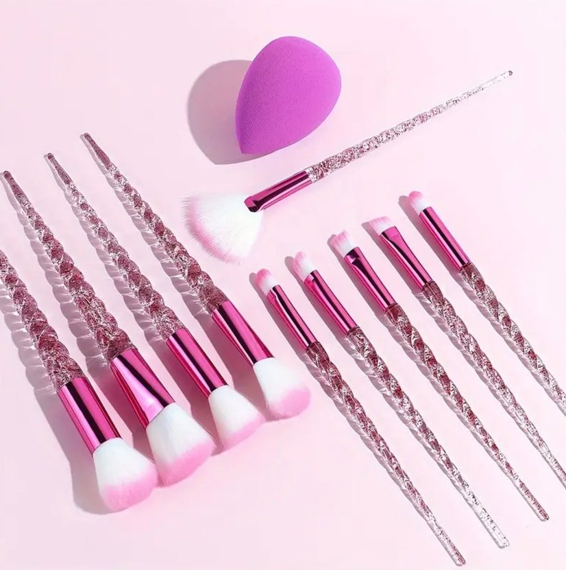 Pastel pembe makyaj fırçası seti, şeffaf burgu saplı fırçalar ve pürüzsüz uygulama için pembe sünger içerir. ️