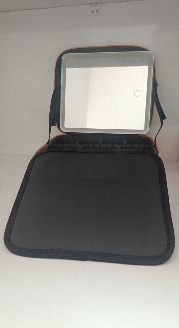 pembe renkte, içinde ayna ve çeşitli bölmeler bulunan makyaj organizeri. Koyu detayları şık bir görünüm sağlar.
