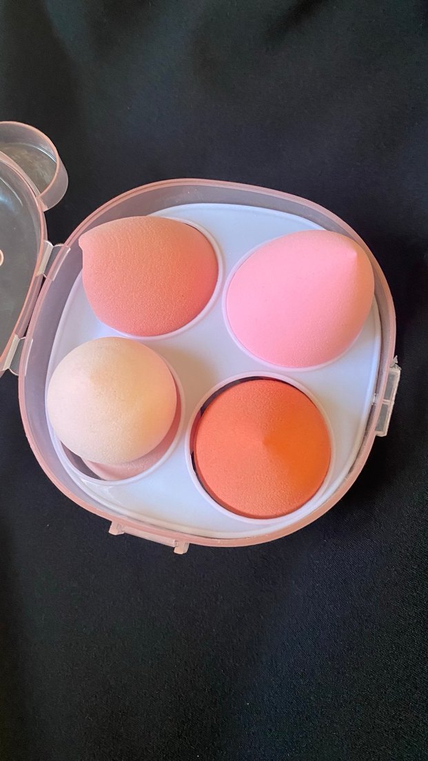 Farklı şekillerde dört adet açık pembe makyaj süngeri, şeffaf kutuda düzenli saklama imkanı sağlar.