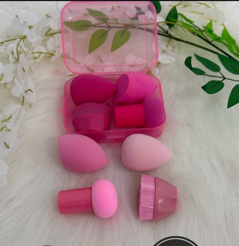 Şeffaf pembe kutuda pastel pembe makyaj süngerleri ve fırçalar seti, fondöten ve diğer makyaj ürünleri için uygundur.