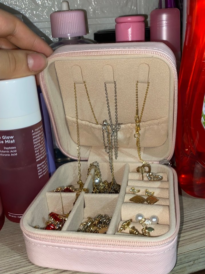 Pembe renkte, yüzük, kolye ve küpe için bölmeleri olan makyaj ve takı düzenleyici kutu. Eşyalar düzenli şekilde saklanır.