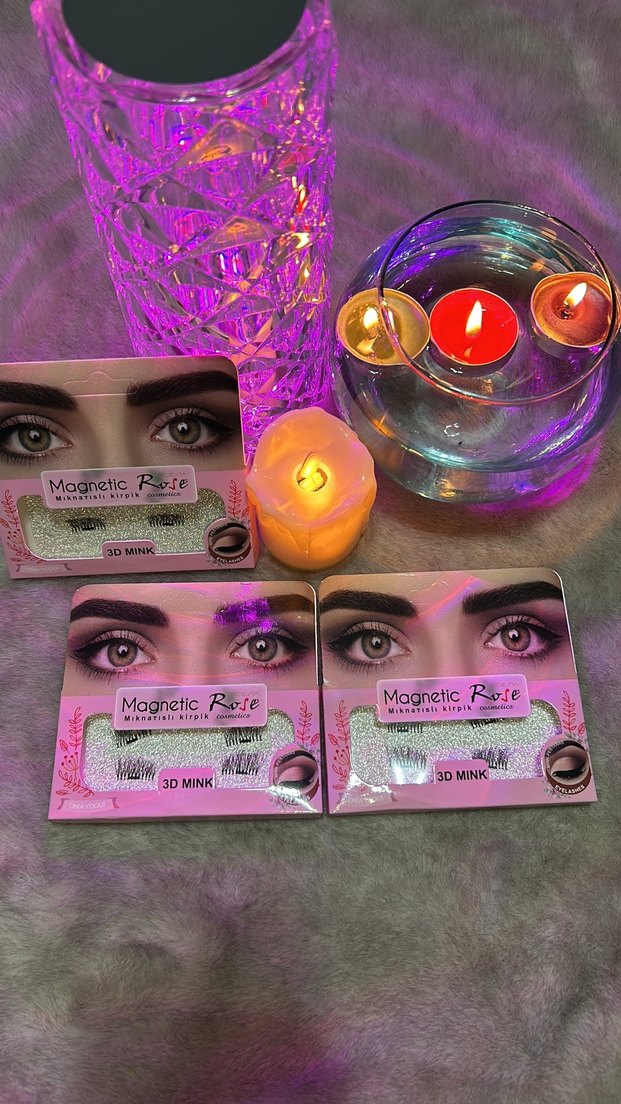 Hafif pembe renkte, 3D kürk fiberden yapılmış Magnetic Rose markalı manyetik takma kirpikler. Kolay uygulanır ve tekrar kullanılabilir.