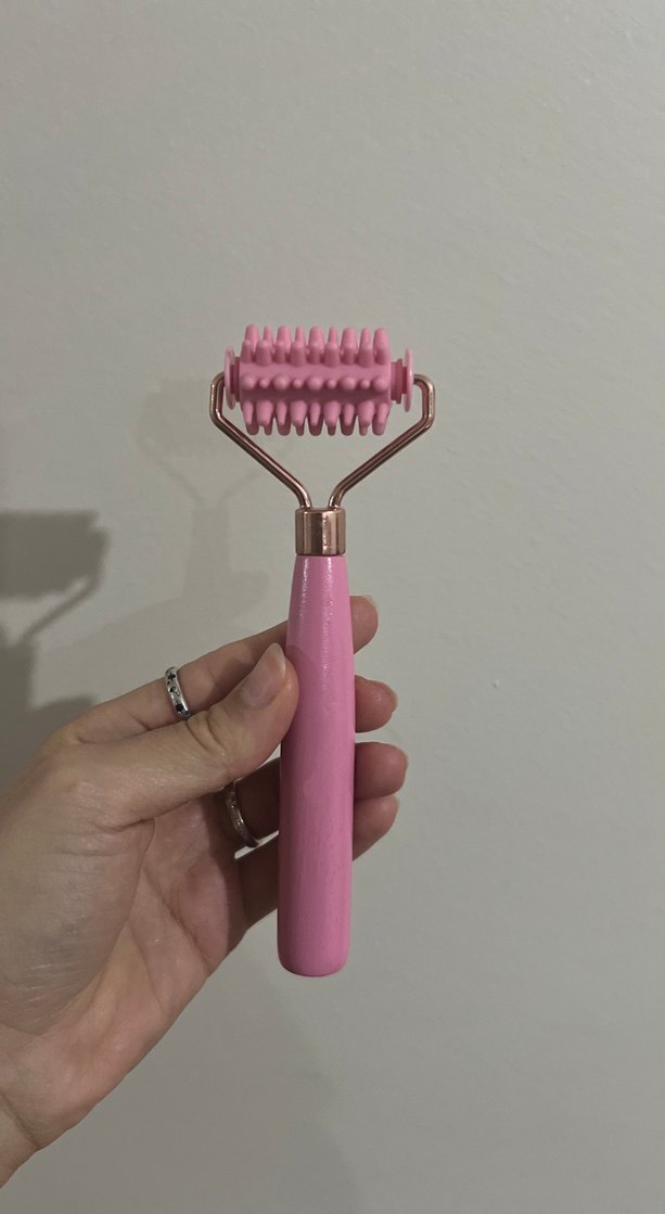 Pastel pembe renkte, dokulu rulo ve pürüzsüz saplı masaj ve cilt fırçası.