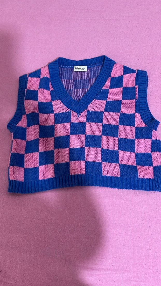 Pembe ve mavi kareli desenli, V yaka, kolsuz örgü süveter. Rahat kesimiyle günlük ve rahat sokak stili için uygundur.