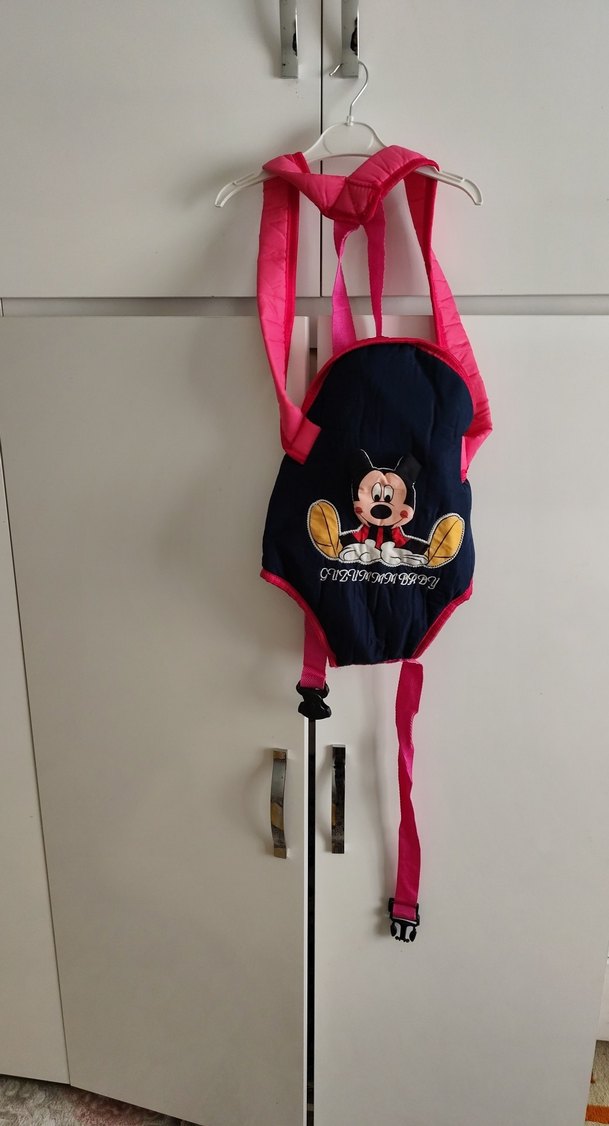 Pembe askılı, lacivert ön yüzeyde renkli çizgi film desenli bebek taşıyıcı. Ayarlanabilir askılarla güvenli kullanım sağlar. hiç bir sorunu yok yeni gibi
