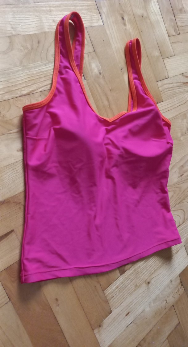 Pembe, straplez yakalı, kolu olmayan, vücuda oturan spor atlet. Pürüzsüz sentetik kumaştan yapılmıştır. Sportif sokak stili için uygun.