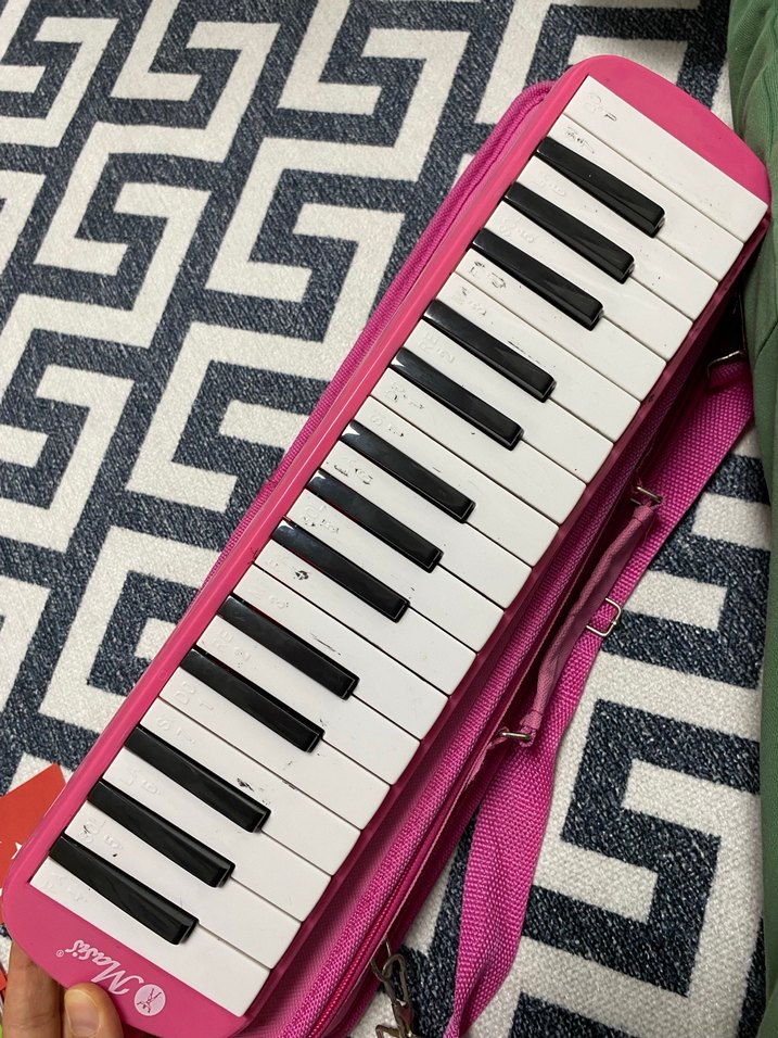 Pembe renkli, taşınabilir kılıfı olan renkli melodika.