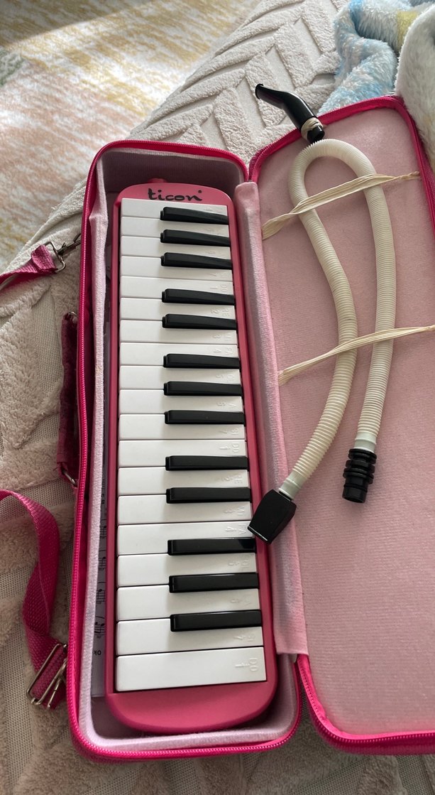Pastel pembe melodika, tuşlu klavye ve esnek boru ile çalınır. Taşıma çantası ile birlikte gelir.