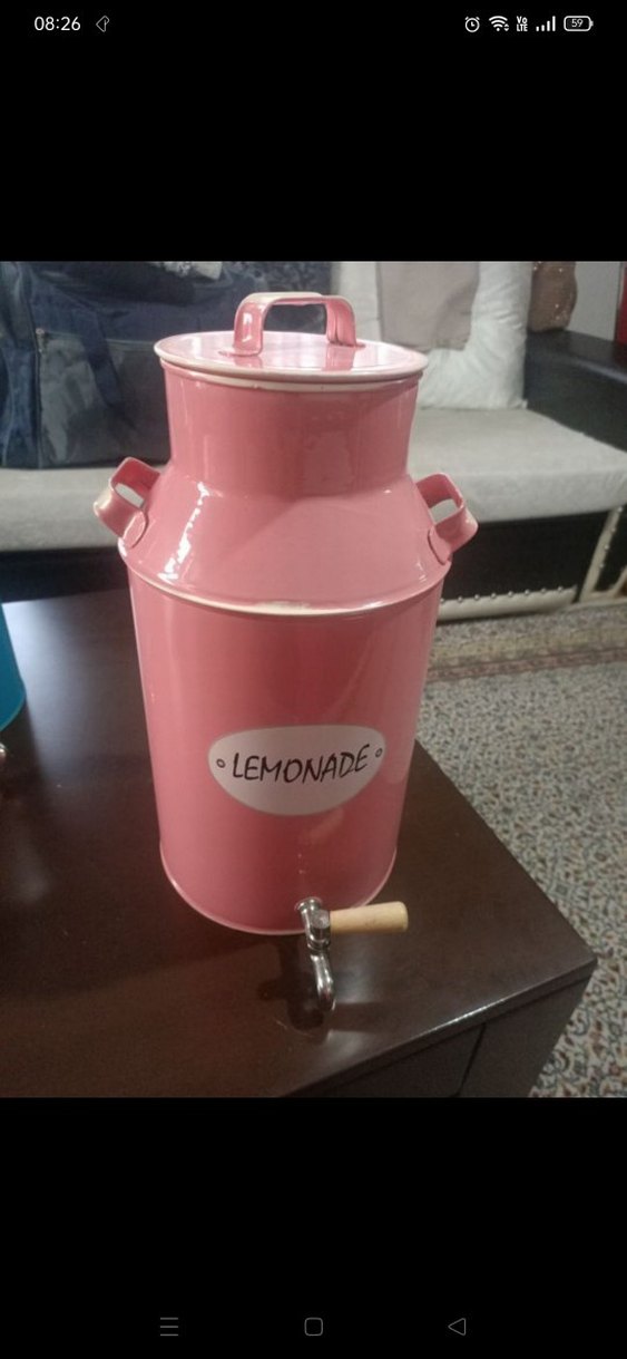 Pastel pembe metal kapaklı, kulplu ve musluklu limonata kabı. Üzerinde "LEMONADE" yazısı bulunur. 7 litrelik