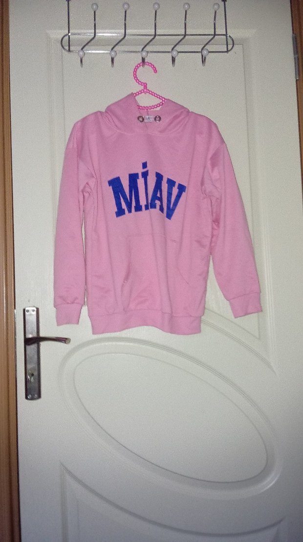Pembe uzun kollu, yuvarlak yakalı ve rahat kesimli sweatshirt. Yumuşak fleece kumaştan üretilmiş, önünde MIAV baskısı ve örme dokusu bulunur.