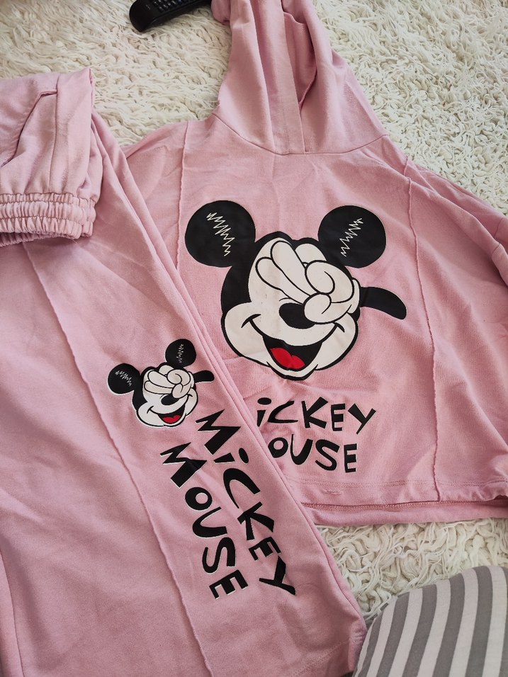Pembe renkli, kapüşonlu ve düğmeli, bol kesim pamuklu eşofman takımı. Mickey Mouse baskılarıyla sokak stiline uygun rahat bir seçenek.