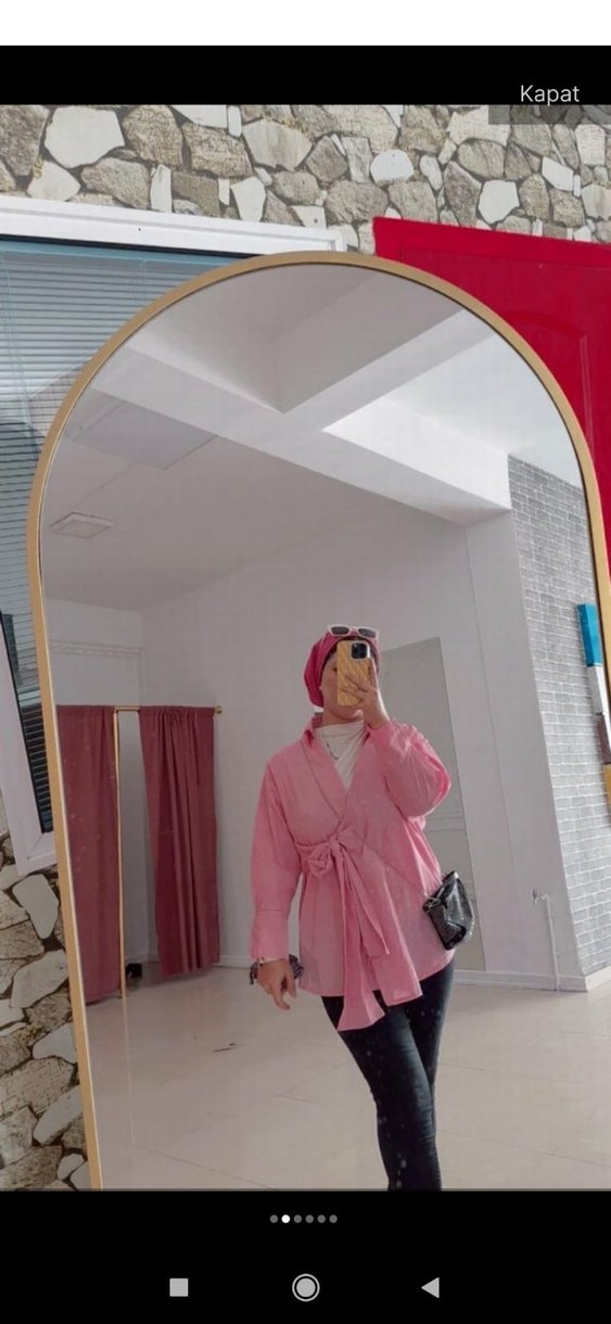 Kadın gömleği, bol kesim, yüksek yakalı ve uzun kollu, sentetik kumaştan yapılmış, pastel pembe batik desenlidir. Günlük kullanım için zahmetsiz şıklık sunar. ️