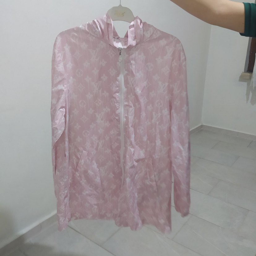 Pembe midi boy kadın yağmurluk, uzun kollu ve fırfırlı detaylı, V yaka ve pastel tonlarda, günlük kullanıma uygun.