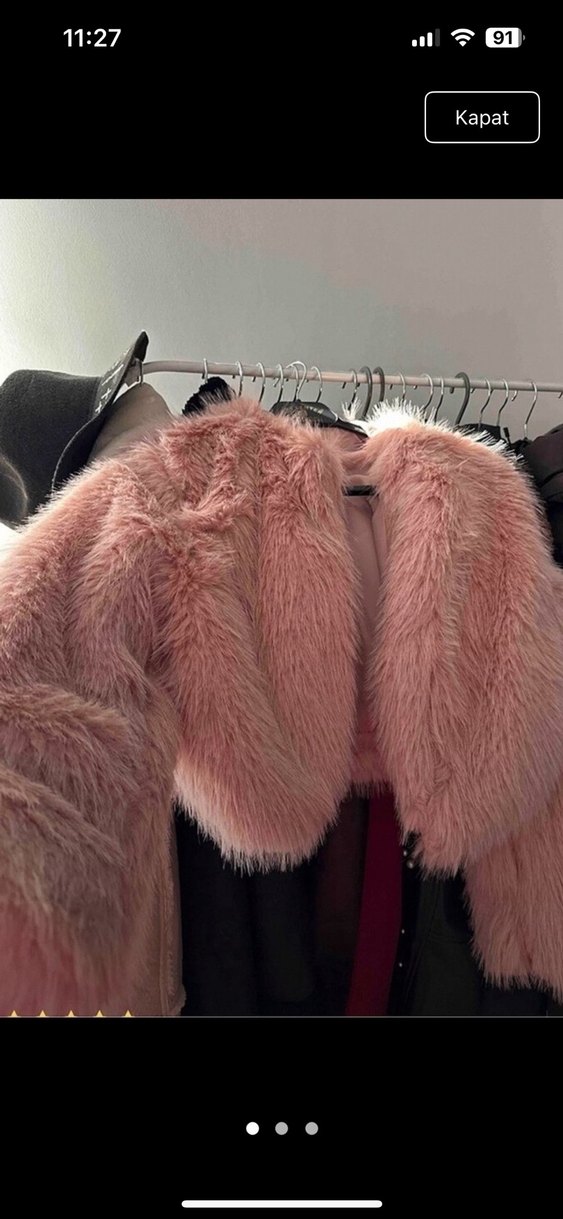 Pembe pastel renkte, kürk detaylı, normal uzunlukta ve dar kesim kadın mont. Notch yakalı ve ince askılı, sokak modası tarzında.