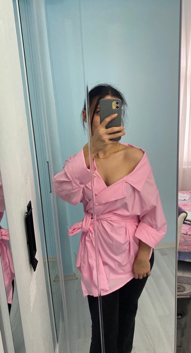 Pembe midi boylu kadın gömlek, loose fit ve halter yaka stilde. Uzun kollu, düğmeli manşetli, pastel tonlarda, yumuşak sentetik kumaştan yapılmıştır. Günlük sokak tarzı için uygundur.