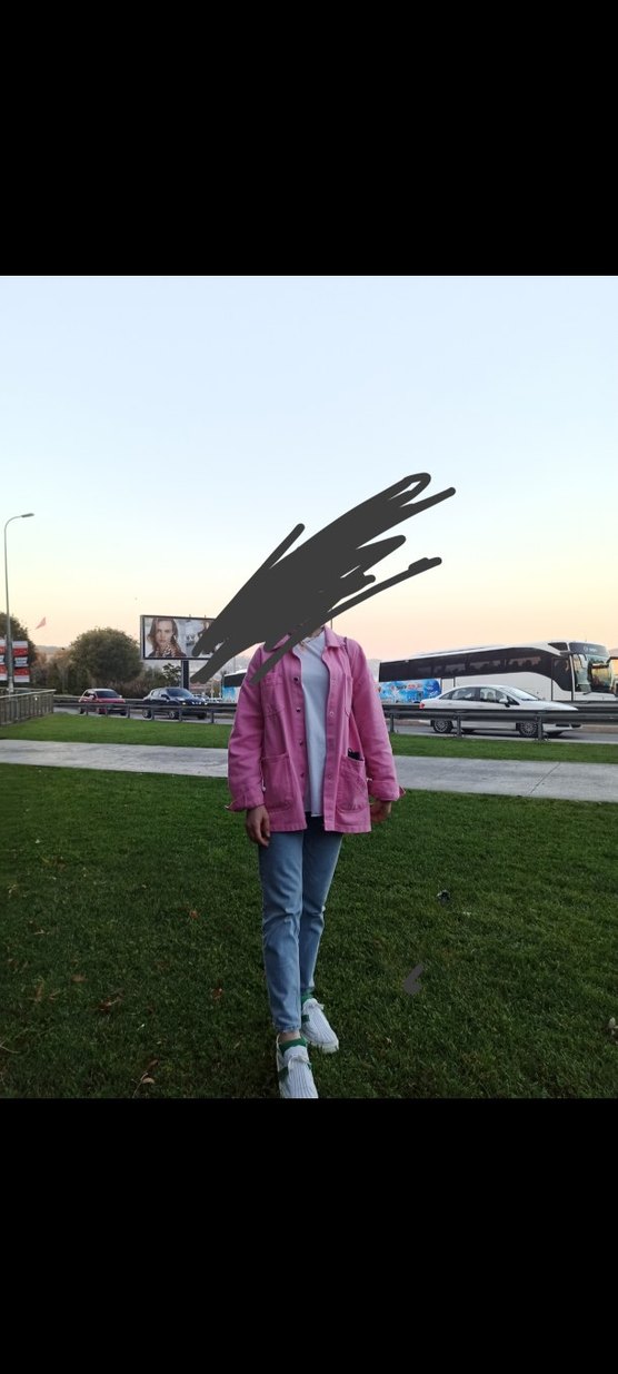 Pastel pembe renkte, uzun kollu, notched lapel yakalı ve bol kesimli midi uzunlukta denim ceket. Rahat ve şık bir dış giyim parçası.