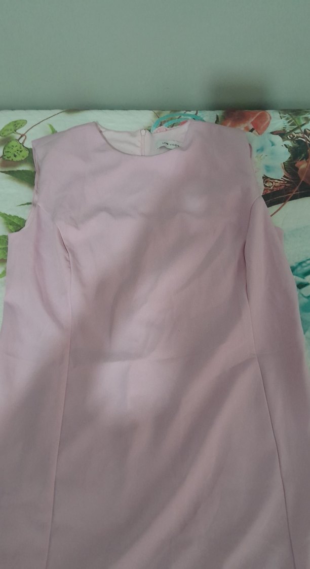 Pastel pembe renkte, kolsuz ve yuvarlak yakalı diz alti boy. Drapeli detaylı, normal kesim ve midi boyda, sentetik kumaştan üretilmiştir.