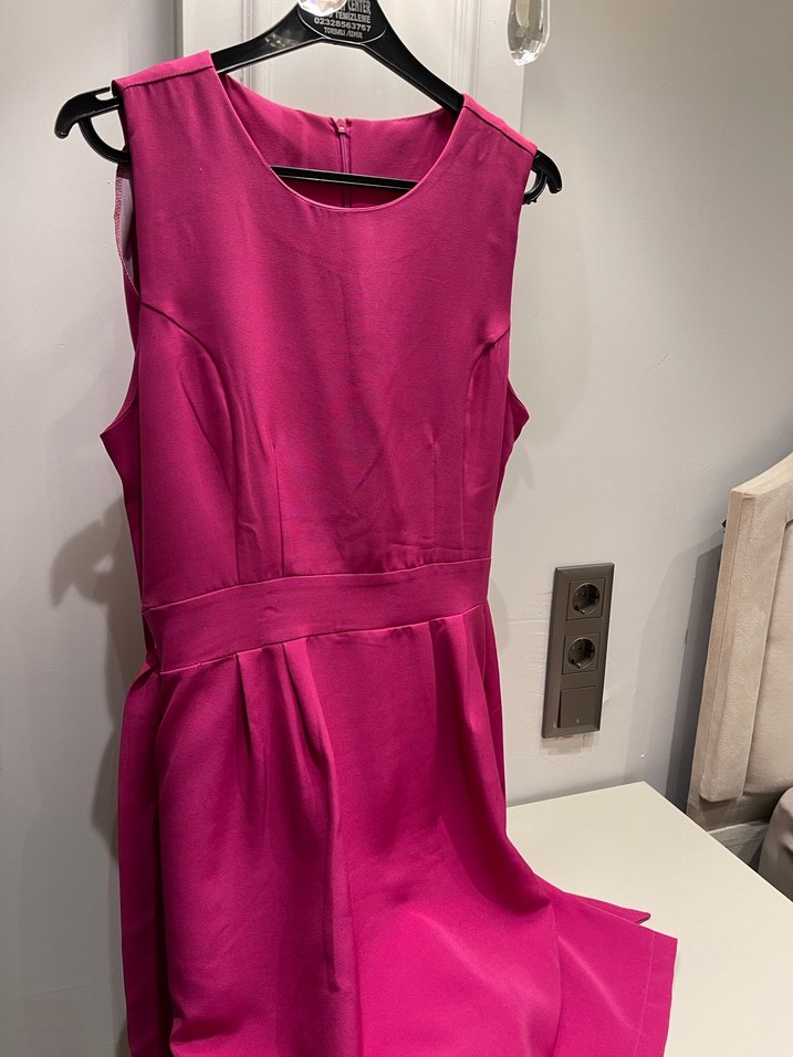 Kolsuz, V yakalı, drapeli detaylara sahip pembe midi elbise. Parlak ve modern tasarımıyla şık bir görünüm sunar.