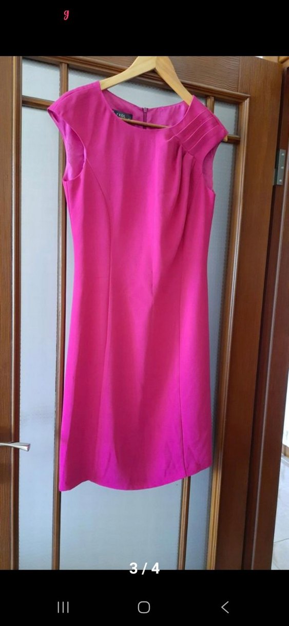 Kolsuz, V yaka ve normal kesim pembe midi elbise, drapeli tasarımı ve parlak kumaşıyla ofis için uygundur.