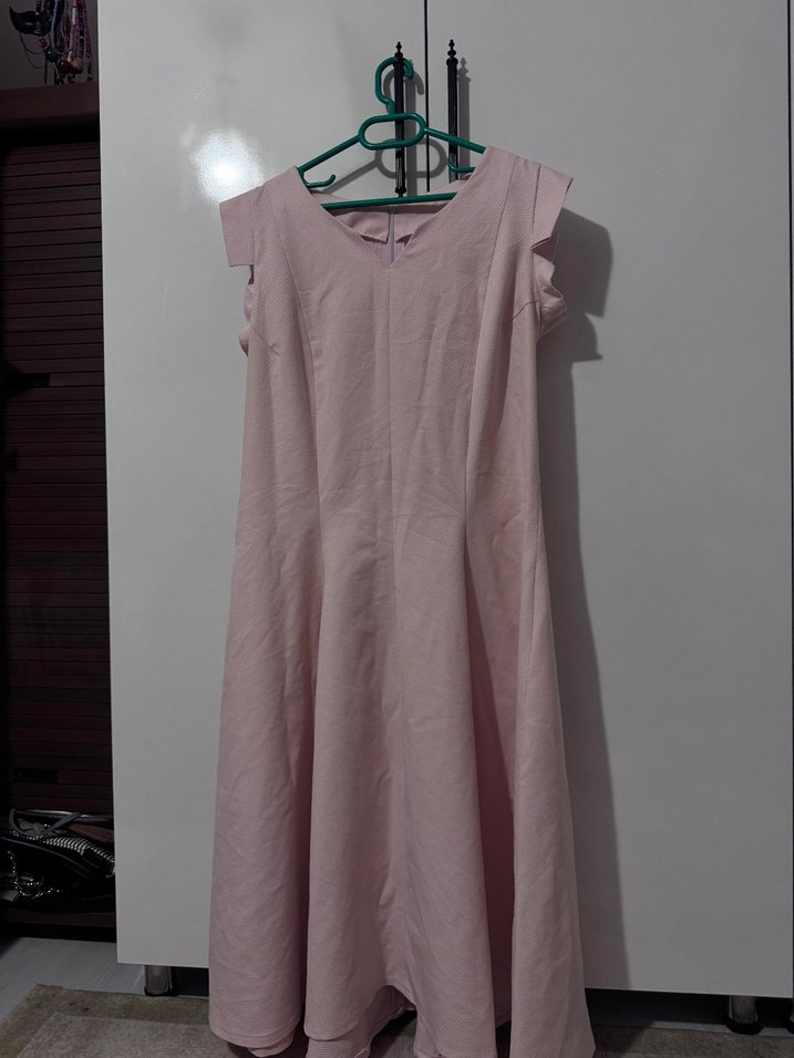 Pembe kumaştan, v yaka ve drapeli tasarıma sahip, rahat kesim, kolsuz elbisesi. Günlük kullanım için idealdir. bedeni yazmıyor. ama 38-40 beden olur gibi
