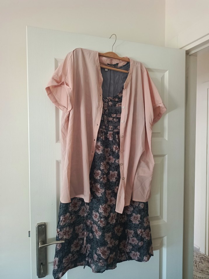 Çiçek desenli midi hamile elbisesi ve hafif pembe düğmeli gömlek. Günlük kullanım için rahat ve salaş.