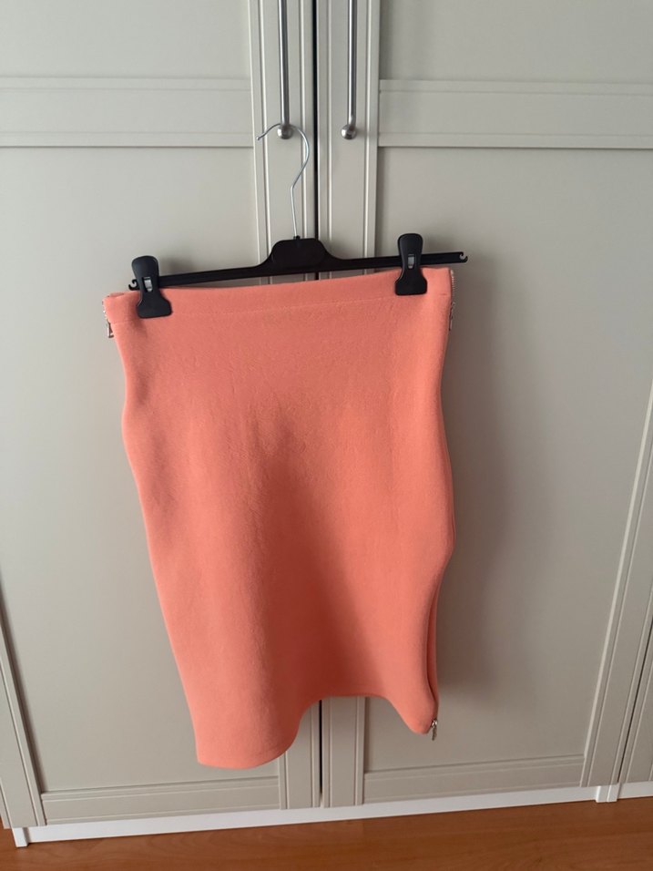 Yumuşak ve sıcak kumaştan, pembe midi uzunluğunda, vücuda oturan eteği, günlük kullanım için zahmetsiz şıklık sunar.