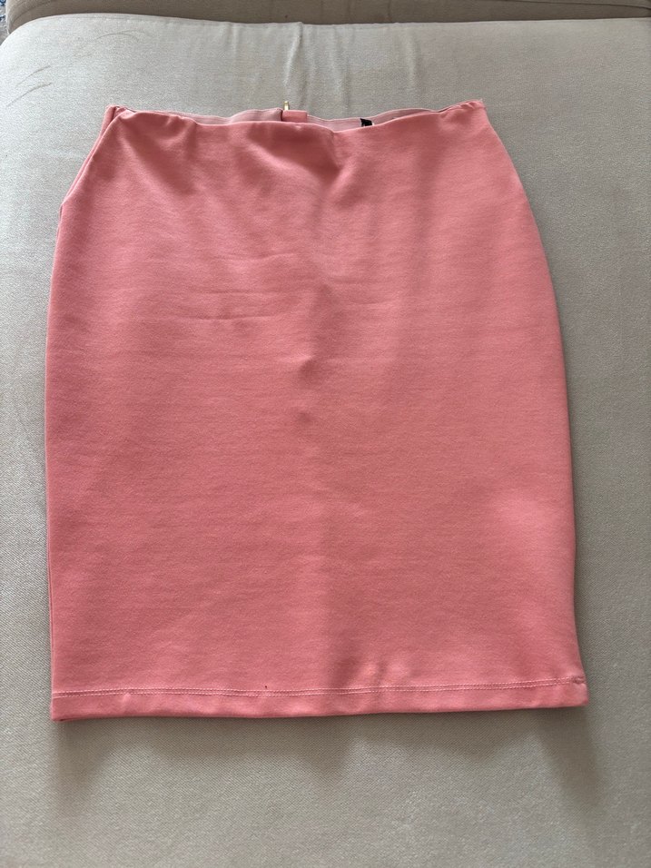 Pembe renkte, düz ve kalem kesim midi hamile eteği, rahat sentetik kumaştan yapılmıştır, günlük kullanıma uygun sade ve şık bir tasarıma sahiptir.