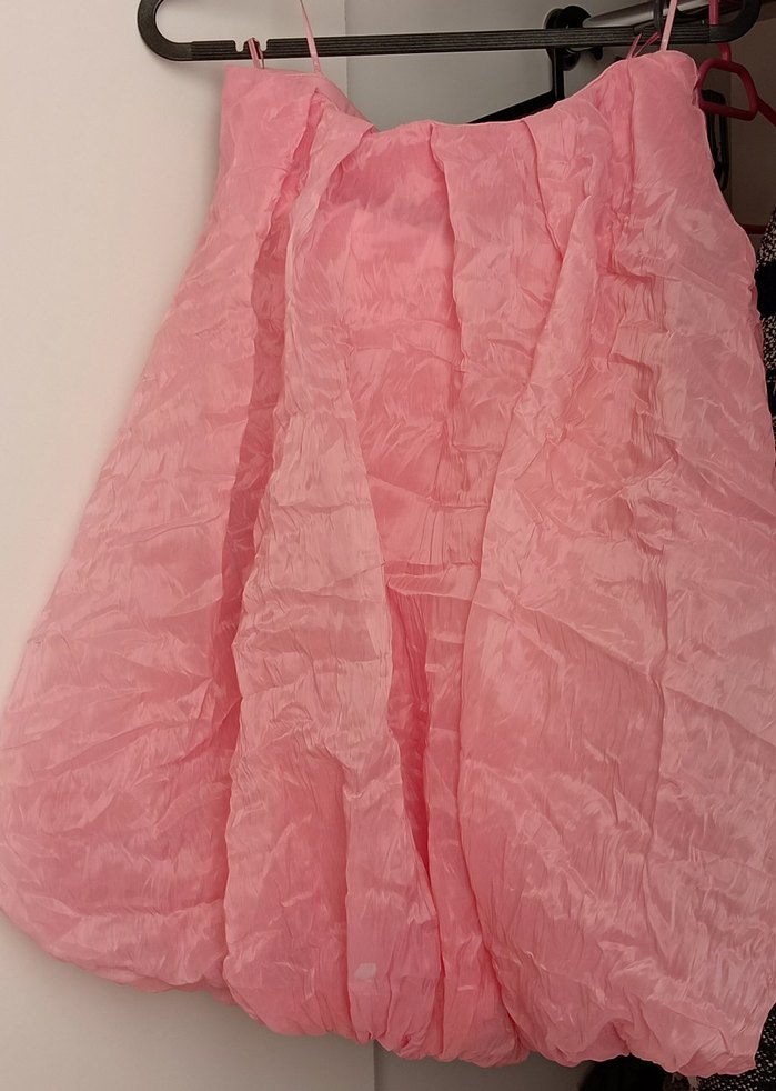 Pembe pastel renkli, keten kumaştan, bol kesim ve drapeli hamile midi eteği, şık parti kombinleri için uygun.