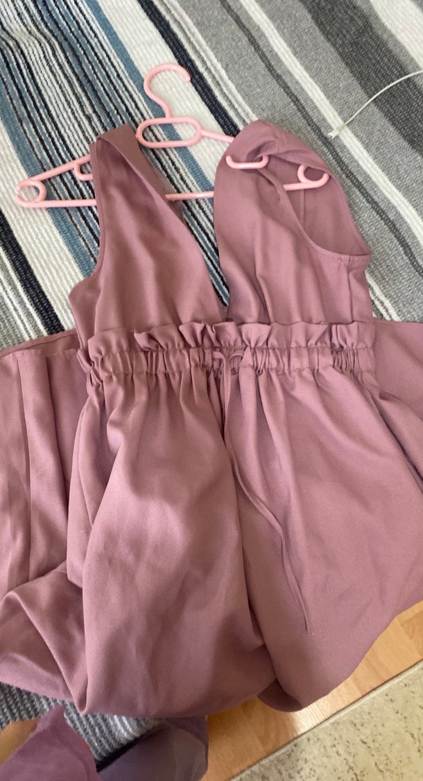 Pembe midi tulum, V yaka ve fırfır detaylıdır. İpek gibi kumaştan, askılı kollu ve rahat kalıplıdır. Günlük kullanıma uygundur.