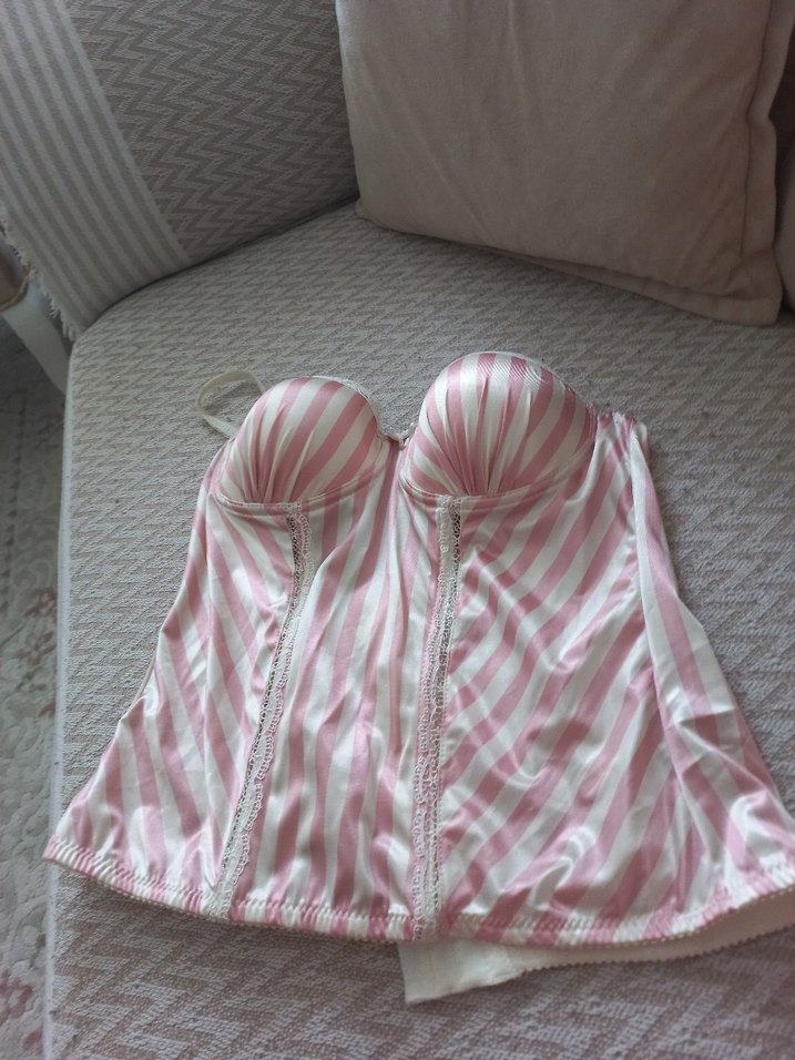 Pembe renkli, midi boy ve çizgili pastel desenli, desen içermeyen, vücuda oturan hemşire korsesi. Yapısal destek sağlar.