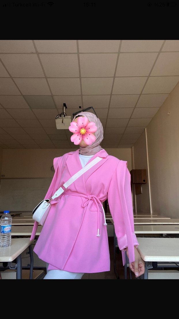 Pastel pembe midi blazer, kesik yaka ve kuşaklı bel detayına sahip. Askılı kollar sade ve mütevazı tarz sunar.
