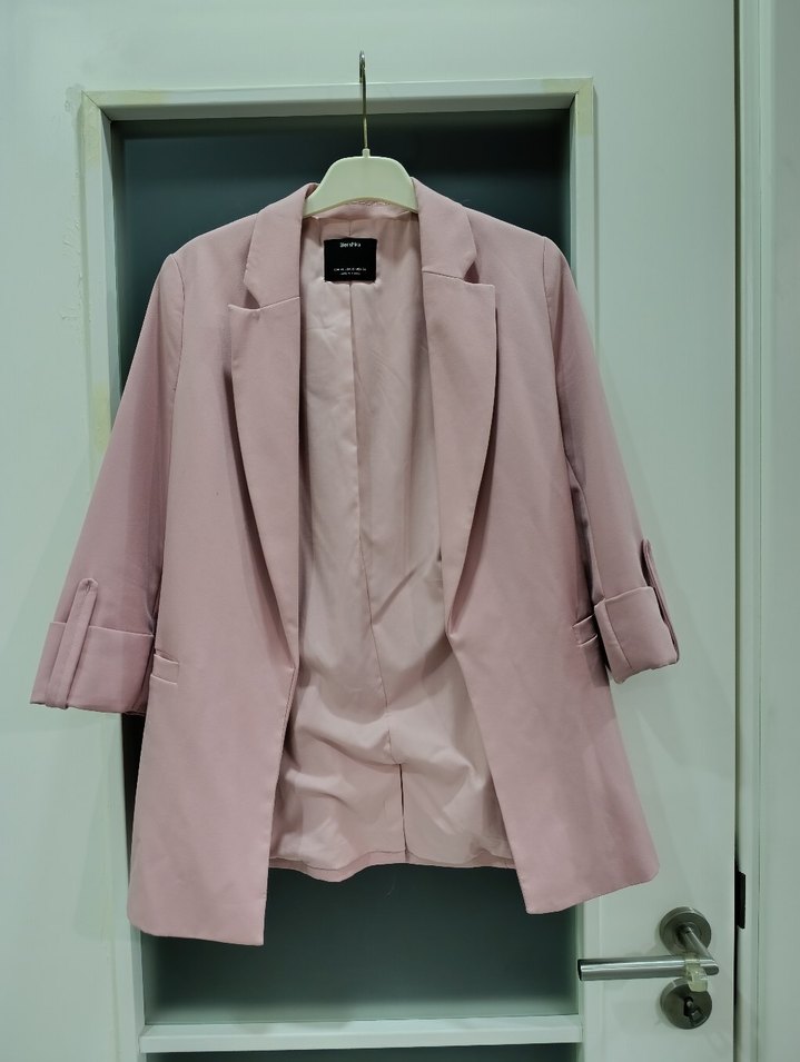 Pembe tonlarında, düğmesiz, normal boy, uzun kollu kadın blazer ceket. Notch yaka ve regular kesime sahip, ofis ve günlük kullanım için uygun.defosu sadece sırtta iplik çekiği ve dikim hatası. omuzdan boy 71 cm göğüs 40 cm