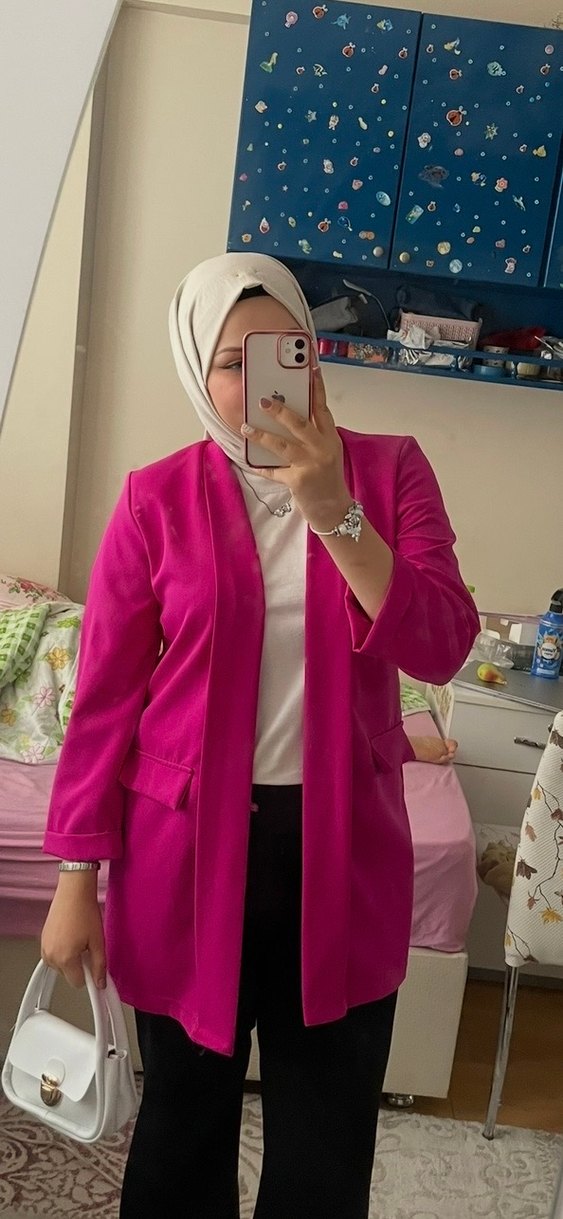 Uzun kollu, normal kesim, notched yakalı pembe bağlama desenli kadın blazer ceket. Günlük sokak stili için şık ve rahat.
