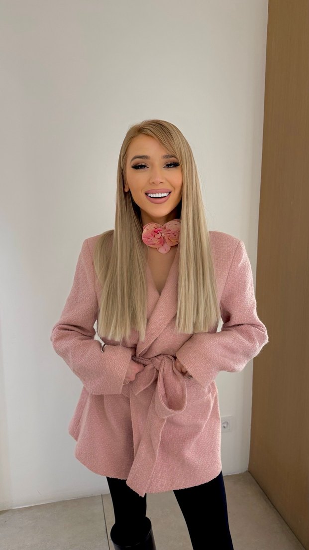 Pembe pastel tonlarda, ipeksi dokulu midi blazer. Normal kesim, uzun kollu ve yakasında klasik kesimle birlikte belde kuşak detayı bulunur. Ofis için uygun.