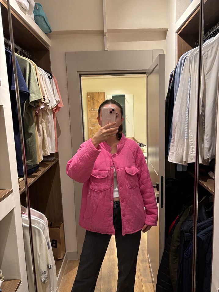 Pembe renkte, düğmeli, uzun kollu, notched lapel yakalı bol kesim midi ceket. Yumuşak ve sıcak kumaştan, günlük kullanıma uygun.