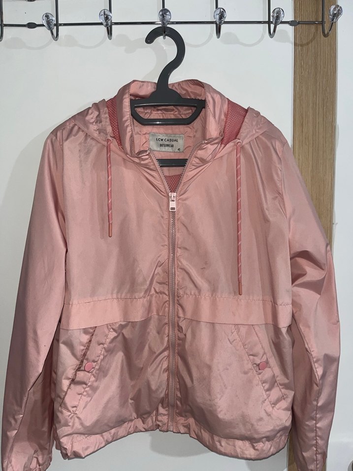Pembe, parlak yüzeyli kadın ceket, fermuarlı ve kapüşonlu. Uzun kollu, normal boyda, bol kesim ve sentetik kumaştan üretilmiştir. Günlük kullanıma uygundur.