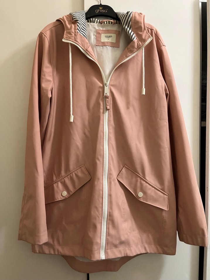 Pastel pembe midi boy, fermuarlı, kapüşonlu kadın ceket. Gevşek kesim, uzun kollu ve düğmeli ceplerle sentetik kumaştan üretilmiştir.