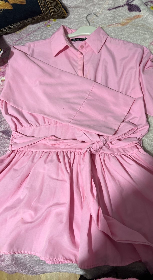 Bu pastel pembe midi elbise, bol kesim, uzun kollu ve bel bağlamalıdır. Desensiz, klasik yakalı, Paris tarzı normcore görünüm sunar.