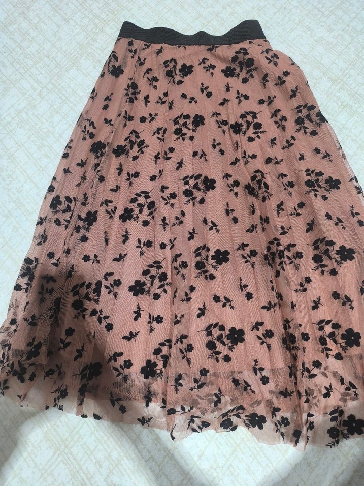 Pembe midi uzunlukta, bol kesim, fırfırlı ve koyu çiçek desenli sentetik kumaştan kadın etek.