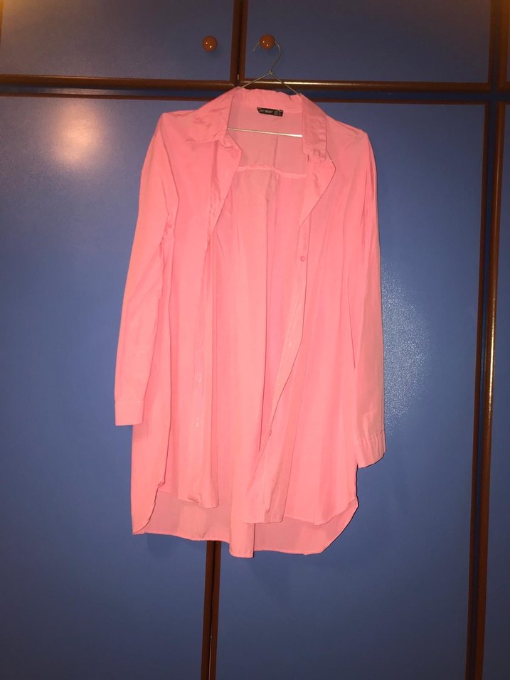 Pembe, dökümlü, midi uzunlukta, uzun kollu, yakalı, sade ve desen içermeyen kadın gömleği. Yumuşak ve parlak bir kumaştan üretilmiştir, günlük kullanıma uygundur.