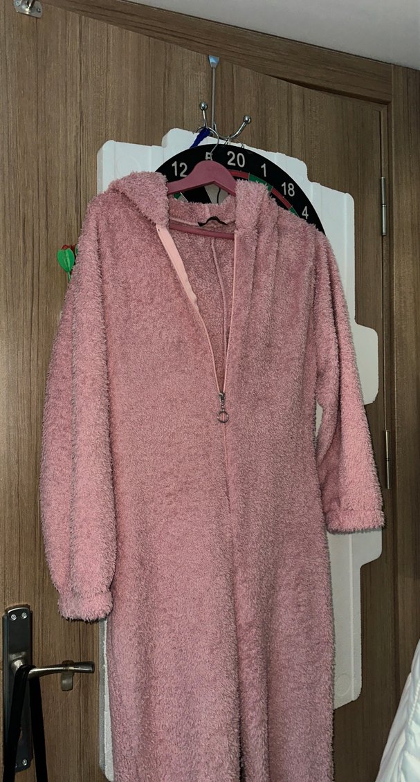 Pastel pembe renkte, kapüşonlu ve uzun kollu, midi boyda salaş kesim kadın tulum . Yumuşak ve rahat kumaştan üretilmiştir, önünde fermuar vardır.