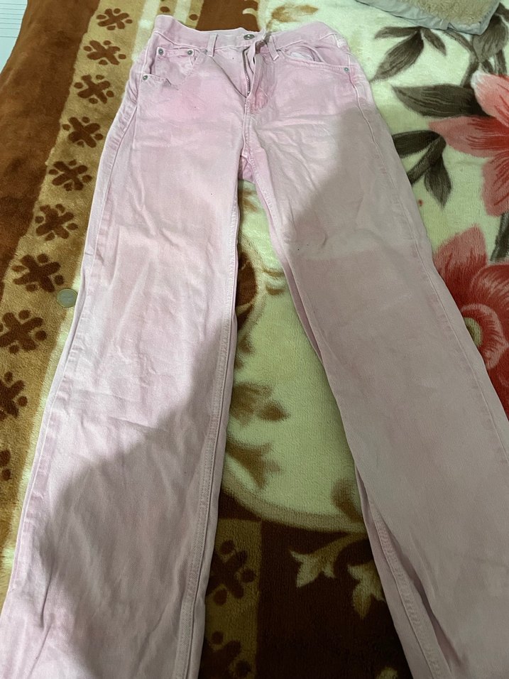 Pastel pembe renkte, sentetik kumaştan yapılmış, normal boy midi kadın kot pantolon, rahat ve şık bir görünüm sunar. ✨