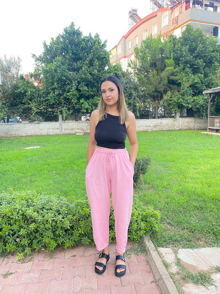 Yumuşak sentetik kumaştan, bol kesim pembe midi pantolon. Desensiz, rahat ve şık, açık hava sokak stili için uygundur.