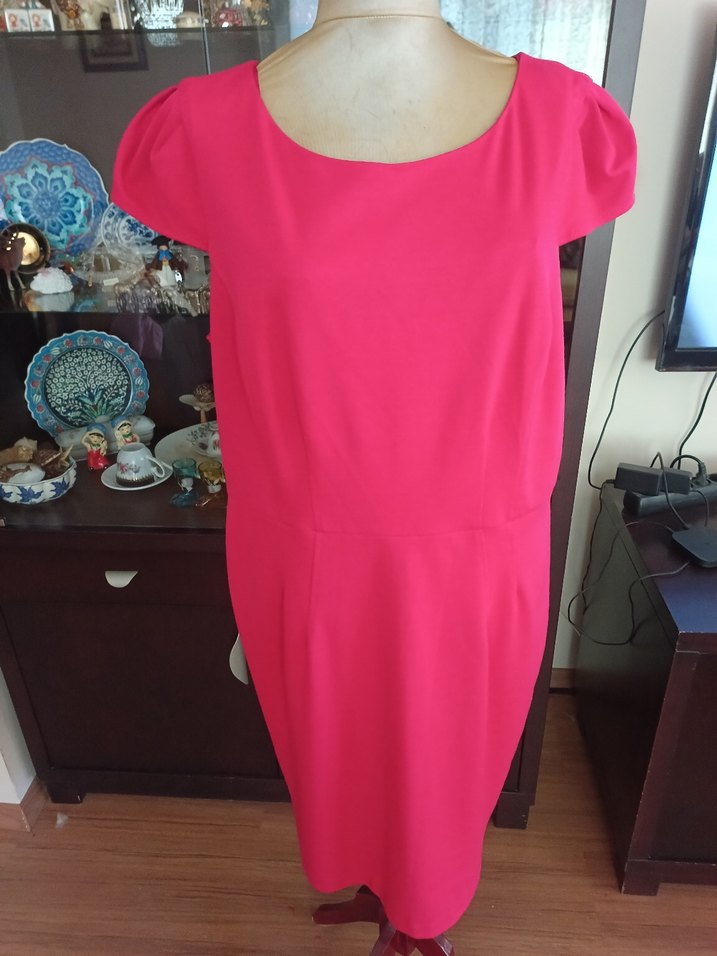 Pembe renkli, yuvarlak yakalı ve kısa kollu midi kadın elbisesi, bol kesim ve drapeli detaylarla .belinde syh kurdelesi vardı kuşak olarak kayboldu siz alıp bakabilirsiniz yada takmazsiniz.olculer üstünde ölçuye göre alın